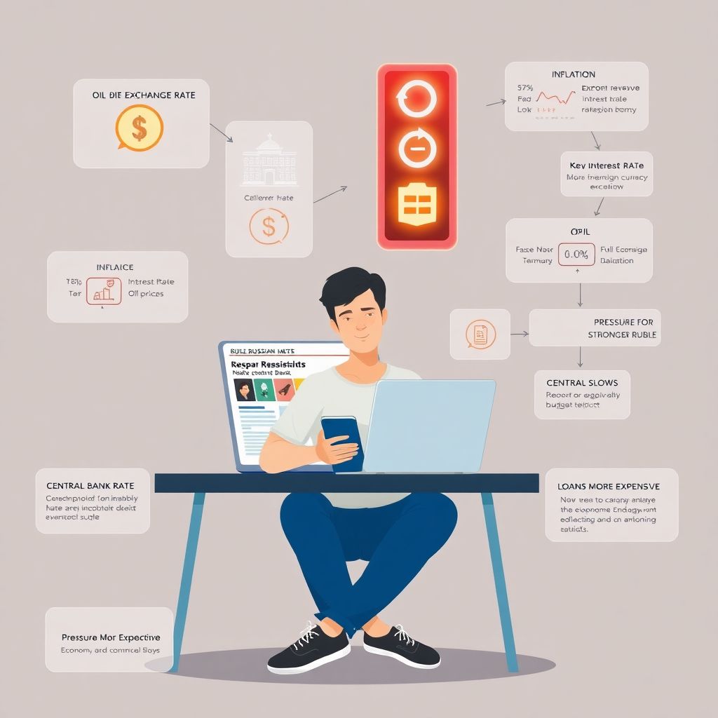 [Диаграмма: Ставка ЦБ ↑ → Кредиты дороже → Меньше спрос на рубли для спекуляций → Рубль может укрепиться, но экономика тормозит.]